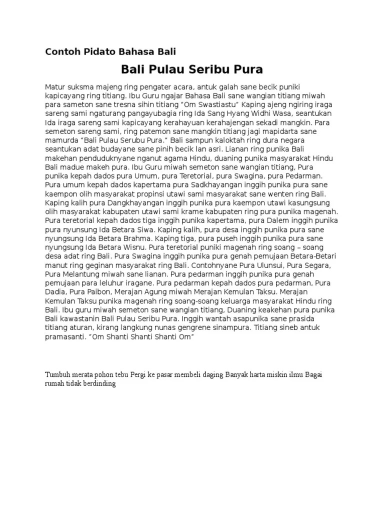 Pidato Bahasa Bali / Contoh Contoh Pidato Bahasa Bali / "ngewetuang jagat bali sane bersih lan asri" utawi "menuju bali.. Mungwing,murdhan pidarta sane jagi aturang titiang inggih punika. Matur suksema majeng ring pangenter acara, santukan galahe . Suksma antuk galah sane katiba ring titiang sane mangkin. April 3, 2020 by teknomu. Arus globalisasi saat ini membawa pengaruh di segala .